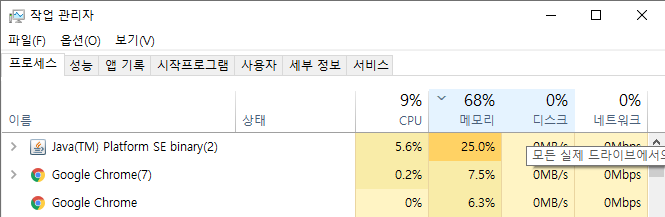 개발과는 관련없는 내용이나, 컴퓨터 앞에 하루종일 앉아있는 입장으로 근래에 컴퓨터가 너무 버벅대서 메모리를 확인해봤더니 (시작표시줄 - 우클릭 - 작업관리자 - 성능 탭) 메모리가 97%~100%를 계속 왔다 갔다 한다.