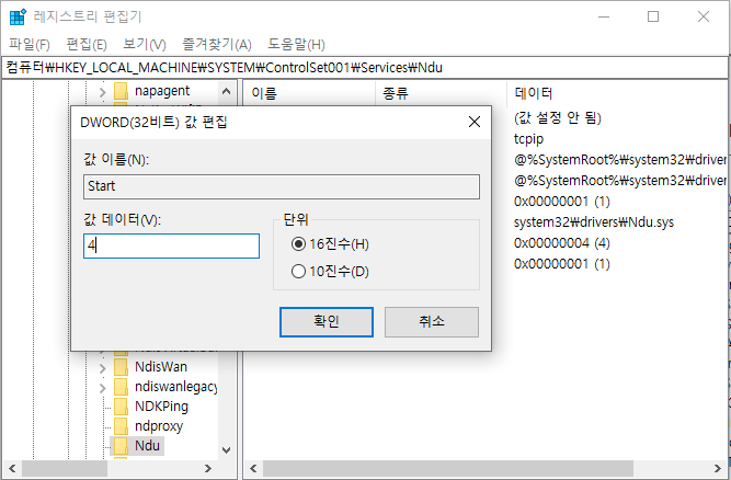 2. HKEY_LOCAL_MACHINE\SYSTEM\ControlSet001\Services\Ndu 위치를 찾아가서 "Start" 값을 찾는다.