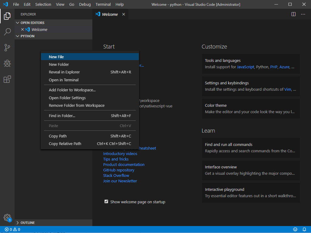 지정된 Workspace영역에 우측 버튼을 클릭하여 [New FIle] 을 이용해 main.py라는 파일을 만들어준다.