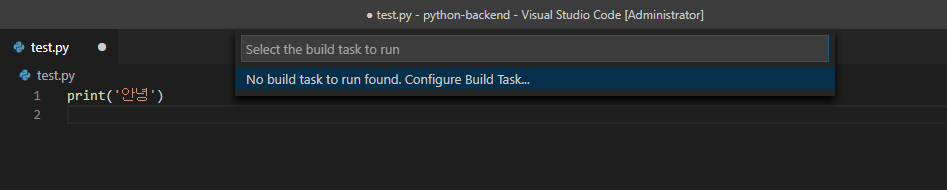 이렇게 기본적인 부분들을 설치하고 test.py파일을 열어 print('안녕')이라고 내용을 입력한 후 Ctrl+Shift+B 를 눌러 빌드해보면 Task작업을 구성하라고 나타난다. "No Build task to run found. Configure Build Task..."를 클릭하고 "Create tasks.json... 어쩌고" 하는 것도 클릭 유형은 "Others... 어쩌고"를 클릭해준다.