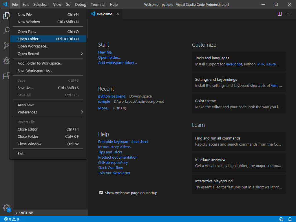 물론 Python을 이용해서 개발을 할 때 파이참(Pycharm)을 많이 사용하기도 하지만 파이참과 Visual Studio Code는 익숙함과 개인 취향정 도로 생각해서 선택해줘도 좋을 것 같다. 일단 아래와 같이 [File] - [Open Folder]를 이용해서 프로젝트 Workspace를 잡아준다.