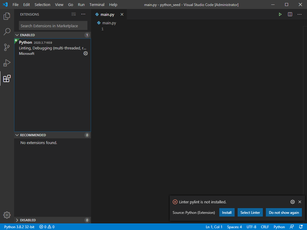 위의 상태에서 아까 만들어놨던 main.py파일을 열어보면 우측 하단에 pylint(빌드나 컴파일 시 에러 외에 추가로 자잘한 오류 검사)를 설치할지 물어본다. Install버튼을 클릭해서 설치해본다.