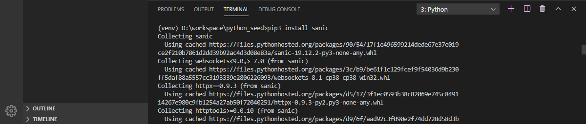 이렇게 환경을 구축한 이유는 sanic을 이용해서 파이썬 프레임워크를 만들어 보기 위해서 이다. 아래의 명령을 이용해서 sanic을 설치해보자.