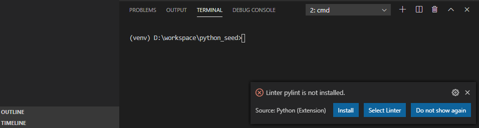 가상 환경이 아직 설정되지 않았기때문에 Python 확장프로그램은 아래와 같이 설치하고, pylint는 설치하지 않았다.