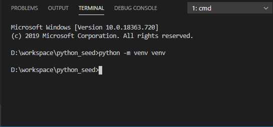 [Ctrl +Shift + `] 키를 눌릴 경우 터미널이 켜진다. 단축키가 싫다면 Terminal - New Terminal 메뉴를 활용한다. 터미널에서 아래와 같이 입력하여 가상 환경을 생성해준다. 제일 끝의 venv만 사용자가 원하는 폴더로 이름을 변경해도 된다.
