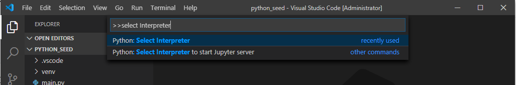 이후 [ Ctrl + Shift + P ] 키를 눌러 ">select Interpreter"를 검색해서 선택한다.