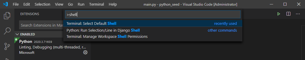 가상 환경 설정 시 Visual Studio Code에서 사용하는 터미널(Terminal)의 경우 PowerShell이 기본(Default)로 설정되어있어서, 가상환경 실행이 잘 안 되는 경우가 있으니 [ Ctrl + Shift + P ] 키를 눌러 나타나는 창에 "shell"을 입력해보면 아래 화면과 같이 "Terminal: Select Default Shell"이라고 기본 터미널 설정을 할 수 있는 메뉴가 나타난다. 선택한다.