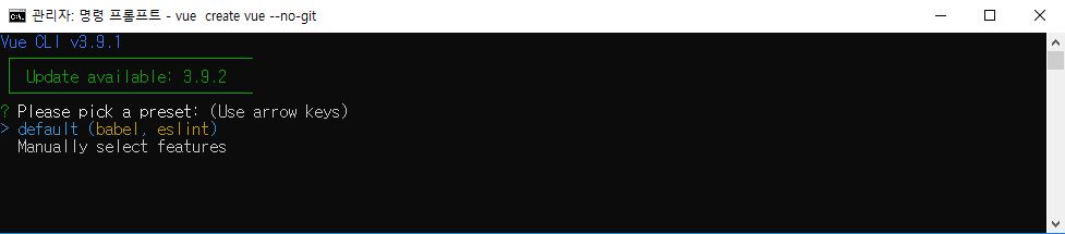 Front-End는 별도로 소스 관리를 하지 않고 Spring Boot 소스와 함께 SVN으로 소스관리를 할 것이라 --no-git 명령을 같이 적어주었다. Back-End 프로젝트 구조가 별도로 나눠질 것도 아니기 때문에 Vue-CLI 프로젝트 이름도 그냥 vue 라고 작성하였다.