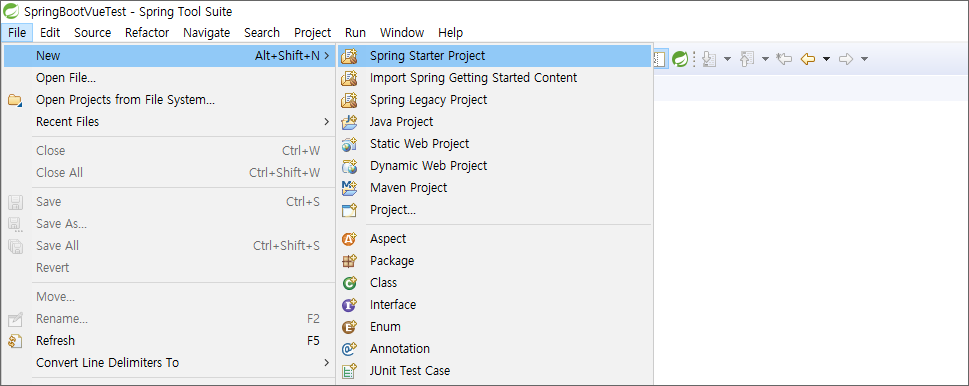 이클립스가 열렸으면 곧바로 프로젝트를 생성해보자 File - New - Spring Starter Project를 선택한다