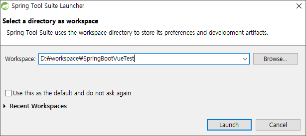 이클립스는 다들 설치되어 있다고 생각하고 바로 프로젝트를 생성해보자. Workspace 이름 이던지 프로젝트 이름이든 이름 짓기는 매우 귀찮으니, 막 나열해서 붙여보자 SpringBootVueTest라는 Workspace를 생성한다.