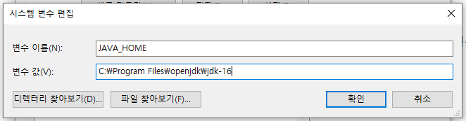 받아서 압축을 C:\Program Files\openjdk 에 풀고 JAVA_HOME으로 아래와 같이 환경 변수 설정