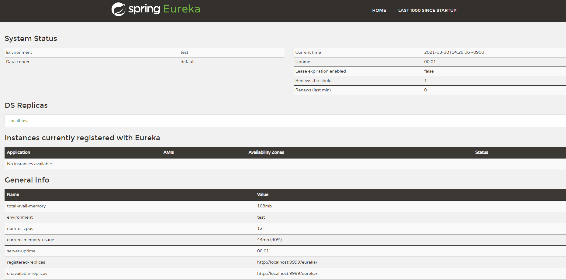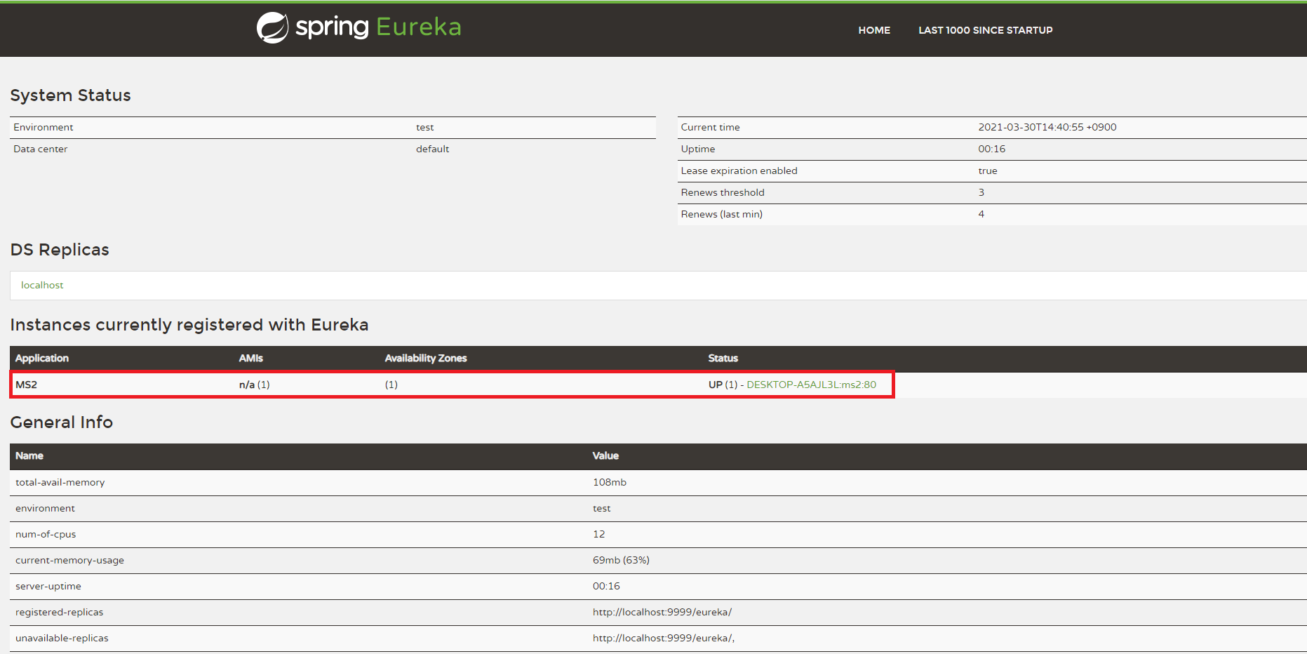 MS2라는 이름으로 애플리케이션이 등록되고.. 이런저런 내용들이 있다. 아까 띄워둔 Eureka서버에 들어가 보자
