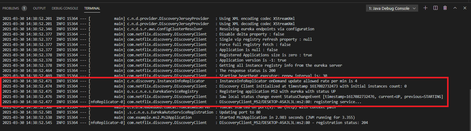 그리고 Ms1 Application.java파일에 아래와 같이 @EnableEurekaClient를 붙여준다.