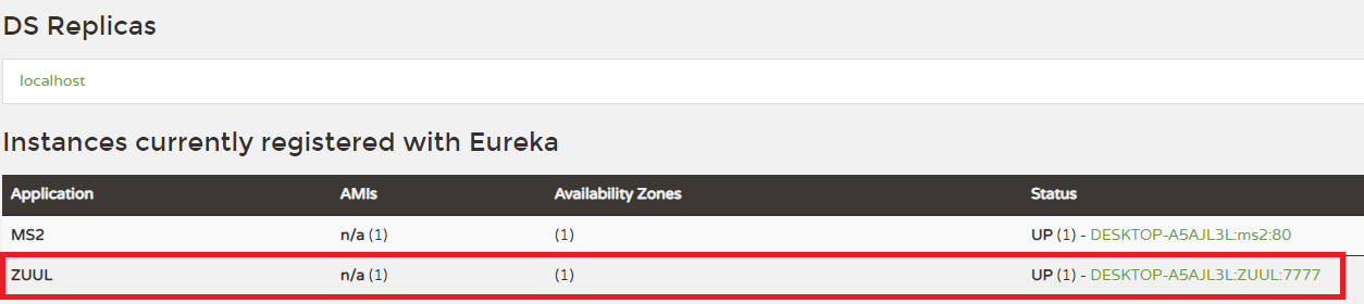 아참 정상적으로 동작하려면 Eureka서버도 동작하고 있어야 한다. Eureka서버에 가보면 아래와 같이 Zuul Gateway도 등록되어 있음을 알 수 있다. 등록되어 있다면 Gateway에서 MS2의 위치도 안다는 뜻이다.