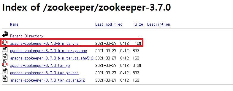 무슨 파일을 받을까 하다가 apache-zookeeper-3.7.0.tar.gz를 받아서 했는데 안되더라, 그래서 찾아보니 -bin이 붙은걸 받아서 하라고 하길래 해당 파일을 받아서 했더니 정상 동작하였다.