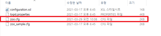 conf폴더 안에 있는 zoo_sample.cfg를 복붙 해서 zoo.cfg로 이름을 변경해준다.