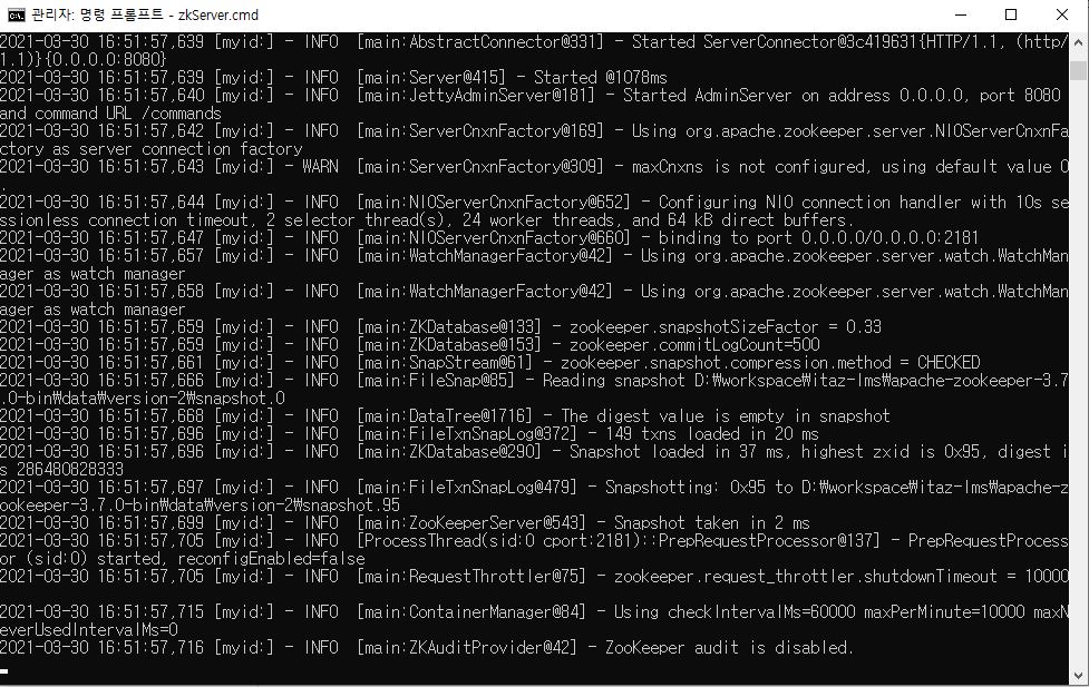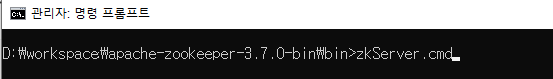 zookeeper를 실행해보자 cmd창을 열어 해당 폴더로 이동 한 뒤 zkServer.cmd를 입력 및 실행한다.