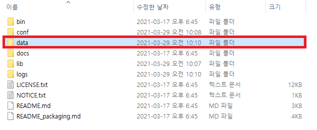 원하는 위치에 압축을 풀고 해당 폴더 내에 data폴더를 생성해준다.