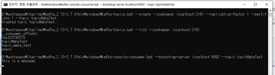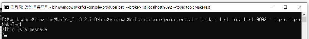 나는 프로듀서에서 창에서 "this is a message"라고 topicMakeTest라는 토픽에 메시지를 전달해 보았다.