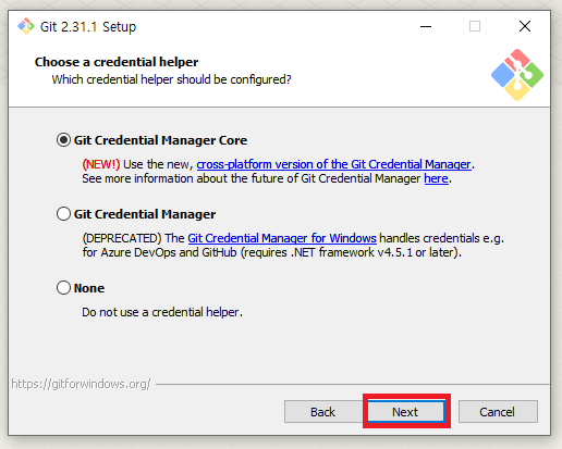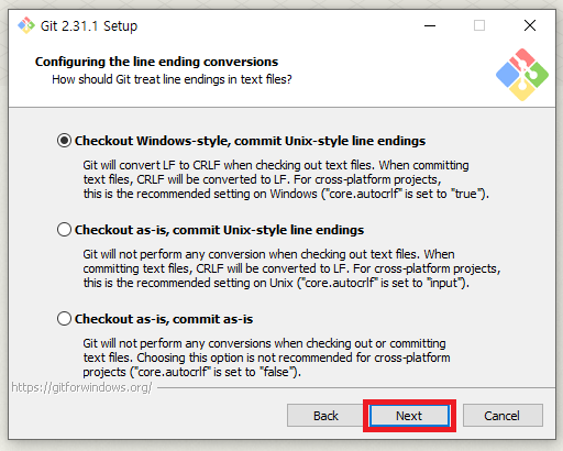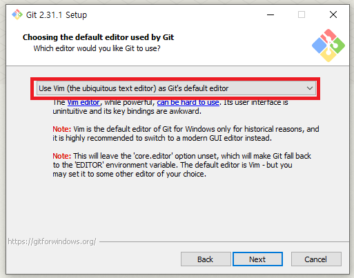Git 에디터로 뭘 쓸 건지 물어보는데 목록에 있는 다른 사용하는 툴도 많이 있긴 하지만 기본값으로 일단 설치해본다.