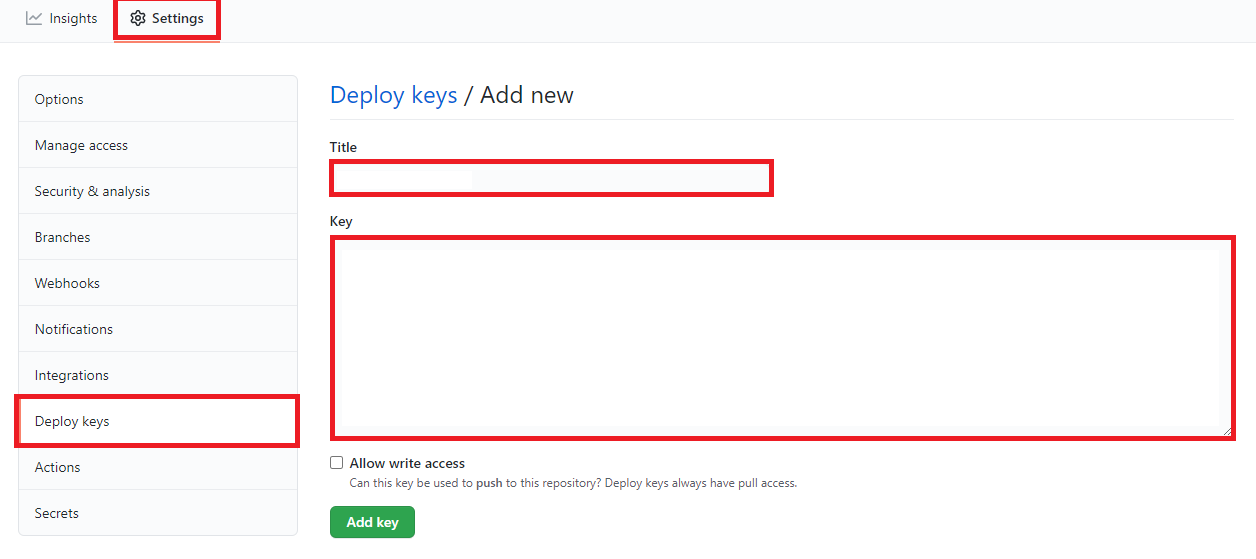 [ Settings -> Deploy Keys -> Add deploy key ] 그러면 아래와 같은 화면이 나타나는데 Title에는 ssh를 설명하는 내용을 적고 key에는 위의 공개키를 붙여놓는다. 그리고는 Add key 버튼을 클릭 (write도 가능하게 하려면 체크박스를 체크해주자)