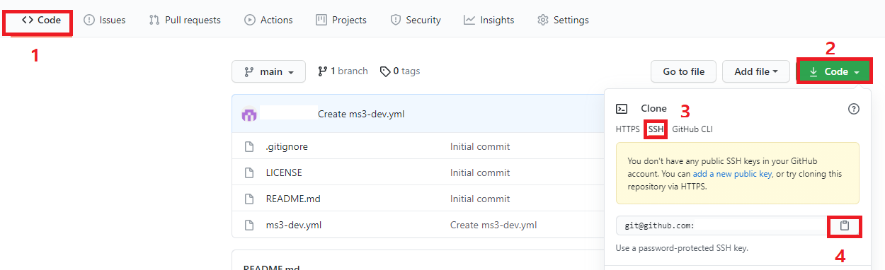 이제 프로젝트에 ssh연결 설정을 하기 위해 해당 저 정소에서 아래와 같이 따라 한다. (id/pass 연결과 ssh연결 주소가 다름)