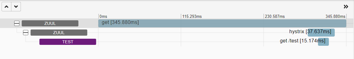 살펴보면 하나의 행은 수집된 트랜잭션이라고 보면 되고 zuul이라고 표시된 부분과 test로 표기된 부분이 span이라고 볼 수 있다.